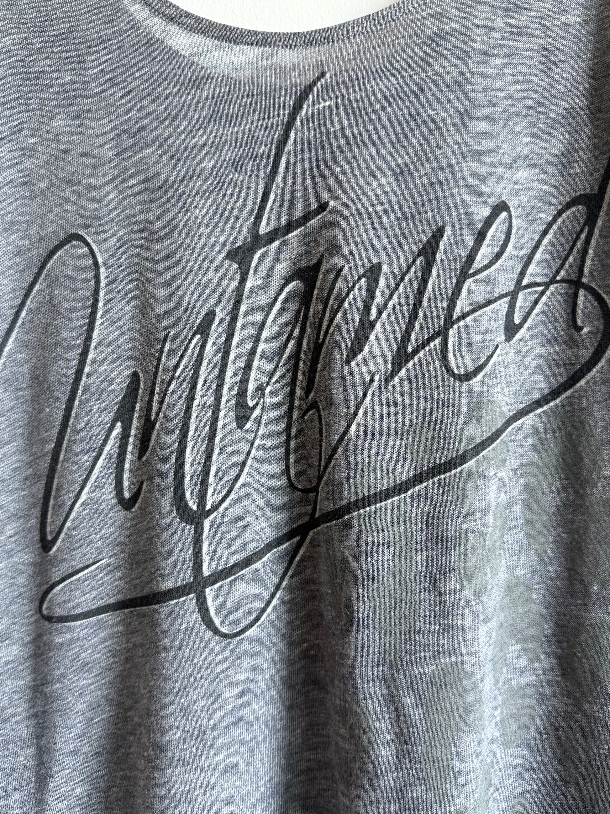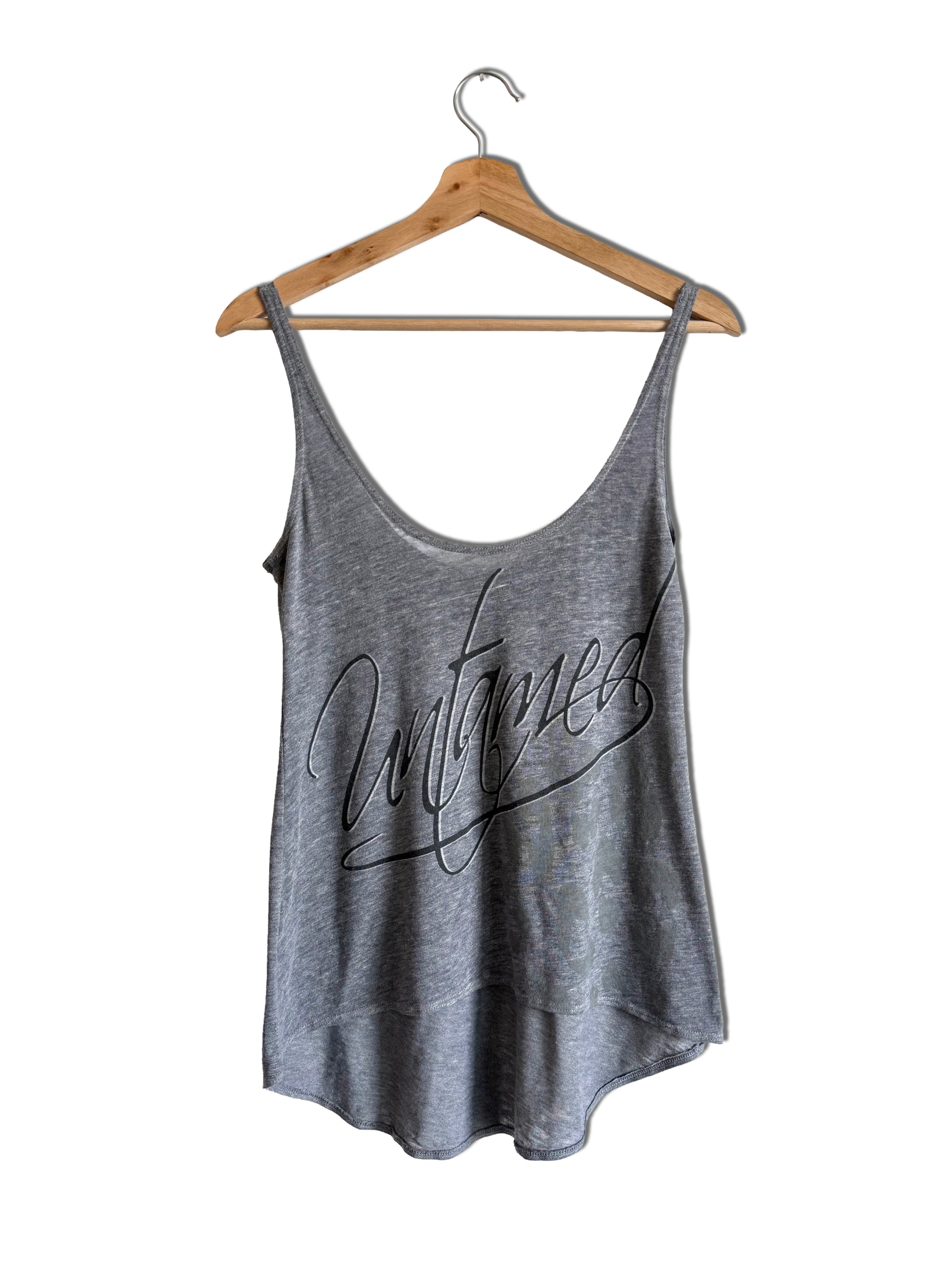 Untamed Cursive Lettering printed on a gray, burnout, tank top with uneven round hem by Chaser Brand